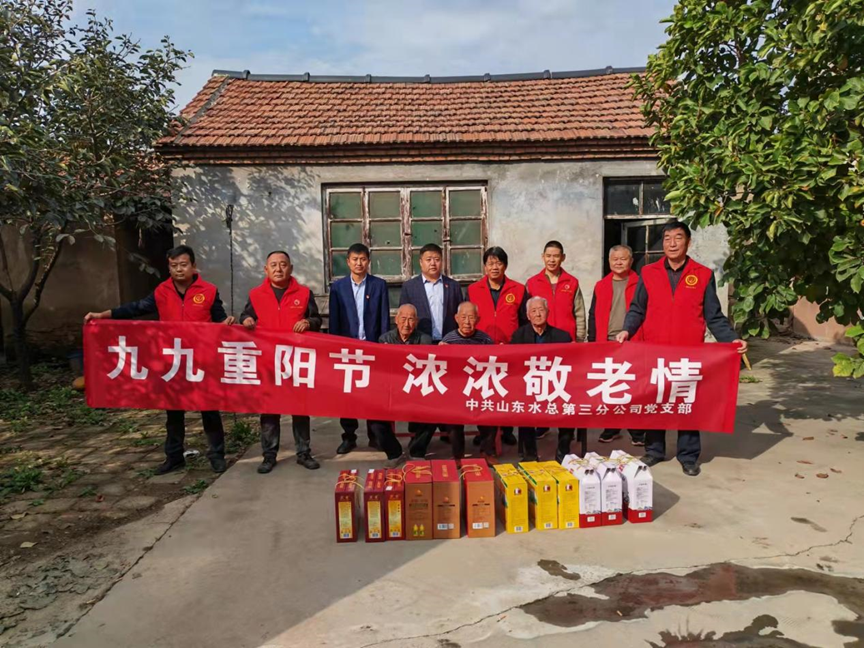为弘扬中华民族尊老敬老的光荣传统,10月14日重阳节这天,第三分公司副总经理杨绪辉、王庆捷一行前往球探网页版邹平市孝妇河提升改造工程施工4标项目部所在地,在高书记带领下看望东吕村的老党员们,为他们带去公司党委的关怀和温暖,送去慰问品并致以节日的问候和祝福。杨绪辉同老党员们亲切拉家常,详细询问了老党员们的生活情况和身体状况,嘱咐他们一定要保重身体,对他们为国家、为社会做出的贡献表达了崇高敬意。