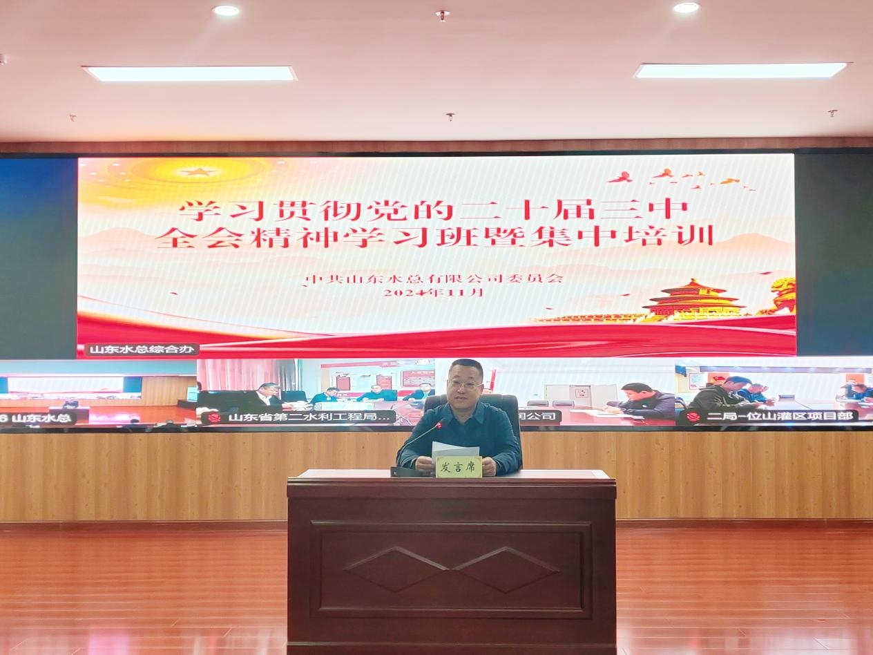 为深入学习贯彻落实党的二十届三中全会精神,按照山东高速集团党委统一部署,11月18日,山东水总公司党委组织举办了党的二十届三中全会精神学习班暨集中培训,教育引导广大党员干部深入领会党的二十届三中全会的重大意义和丰富内涵,切实把学习成效转化为工作实效,推动习近平总书记重要指示要求、全会各项部署及上级党委工作安排在公司落实落地。本次专题学习班为期三天,采取辅导报告讲座、分组集中学习、交流研讨等相结合方式。