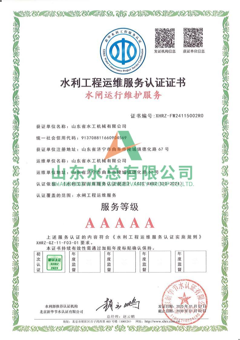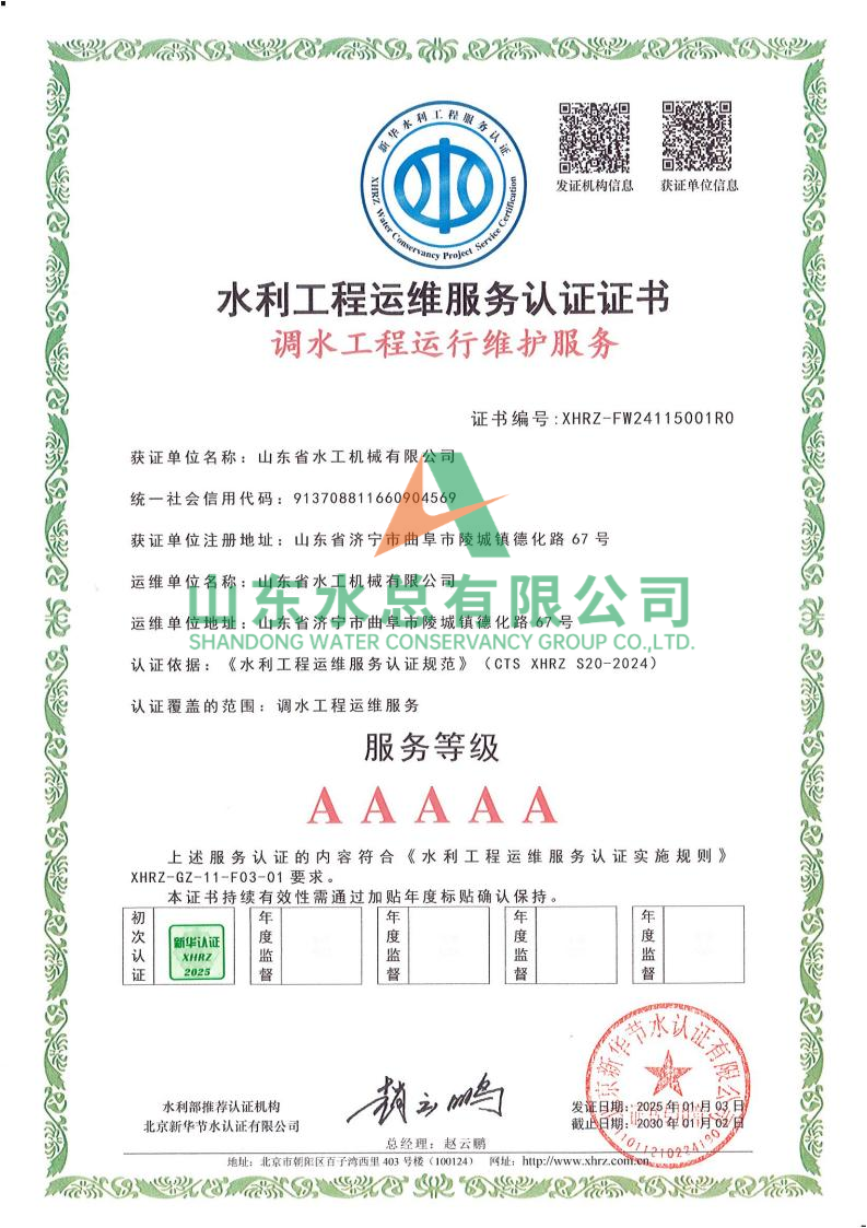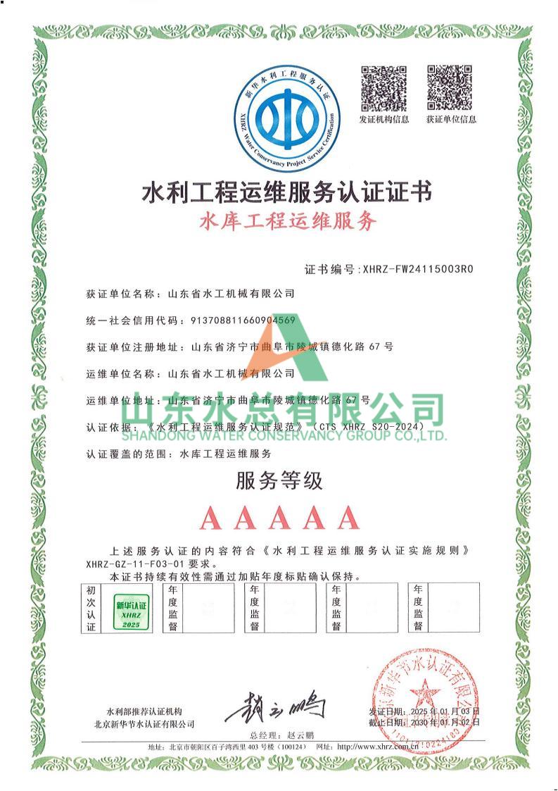 一直以来,水工机械公司高度重视水利工程运维服务的质量与专业性,在人员配备、技术应用、管理体系等多方面精心打磨。在认证过程中,历经严格审核,公司凭借扎实的运维实力、规范的服务流程以及对水利工程运维高规格的执行标准,赢得了认可。